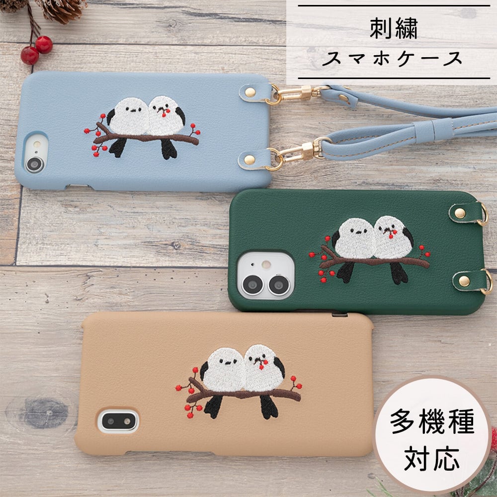 スマホケース 多機種対応 【 刺繍 まるっと シマエナガ 】 スマホショルダー