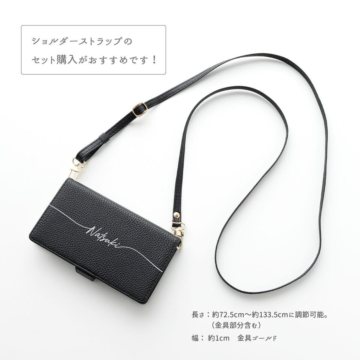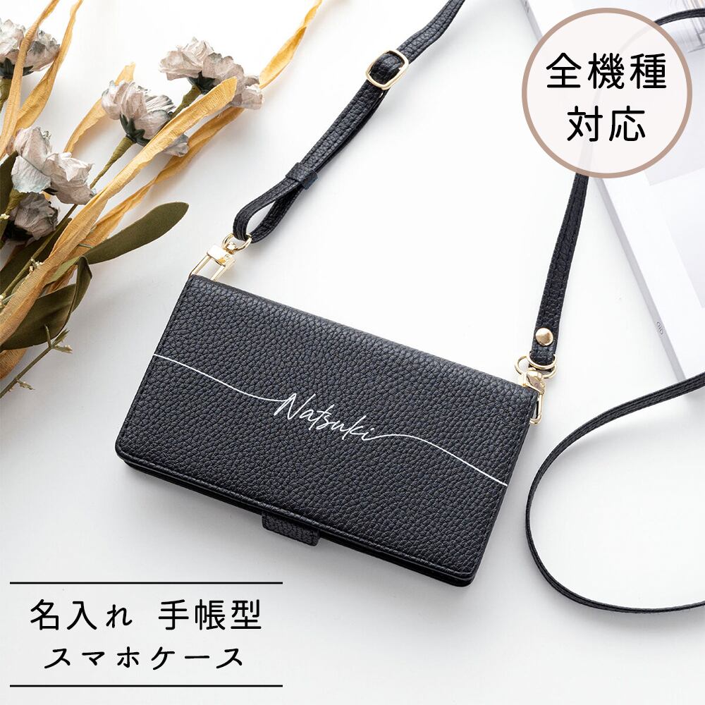 全機種対応 スマホケース 手帳型 【 Simple ブラック 名入れ 】 スマホショルダー 名入れ無料