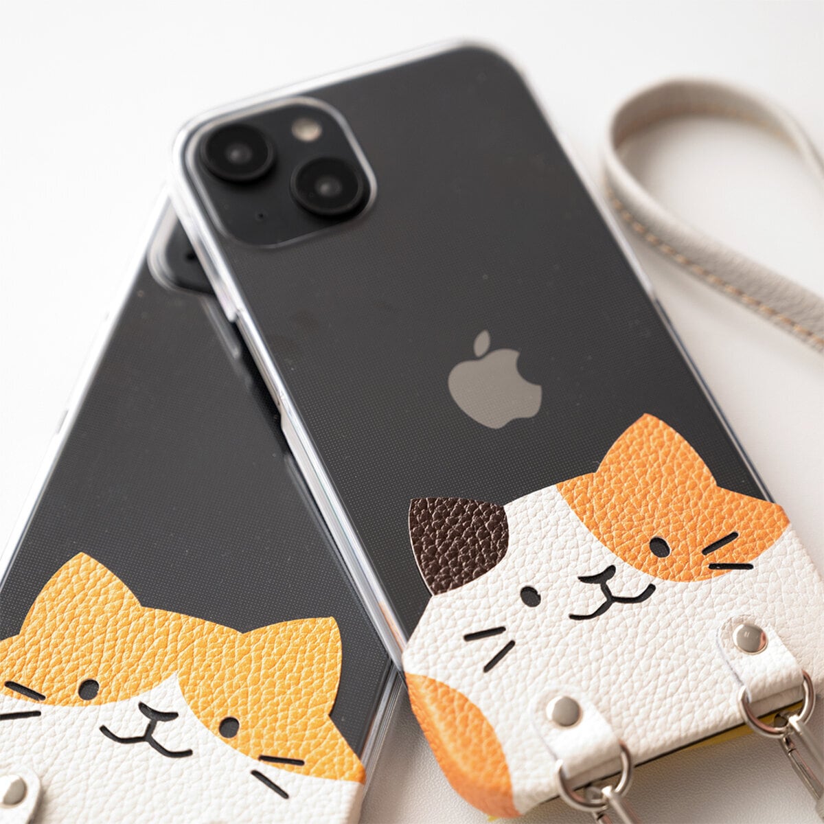 全機種対応 スマホショルダー 【 ちょいまる ねこ 】 クリア スマホケース 本革 レザー ストラップ スマホストラップ